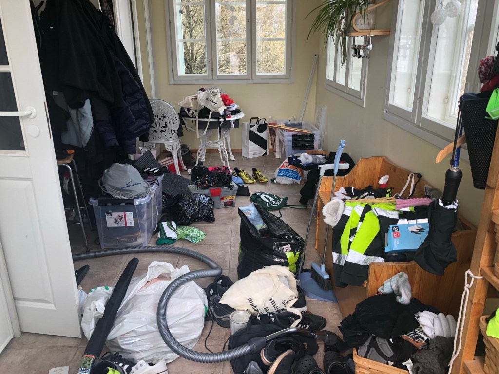 Netflixistä Marie Kondo päälle ja inspiraation hakuun. Konmarin ideana on säilyttää esineet, jotka tuottavat onnea ja löytää kaikille säilytettäville asioille kotipaikka. Eihän mun siis tarvitsekaan heittää mitään pois! Kantapäät tanaan tallatut Adidas Superstarit sisältävät onnellisia muistoja eikä niitä voi heittää pois. Samaisen valmistajan vain ihan pikkuisen rikkinäinen tuulitakki tuo mieleen Ålandia Cupin, jonka aikaisten jatkuvien sään vaihteluiden vuoksi takin vetoketjua vedettiin vuoroin kiinni ja hetken päästä taas avattiin. Eihän sitä mikään vetoketju loputtomiin kestänyt.