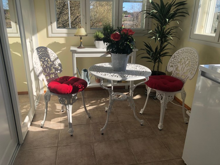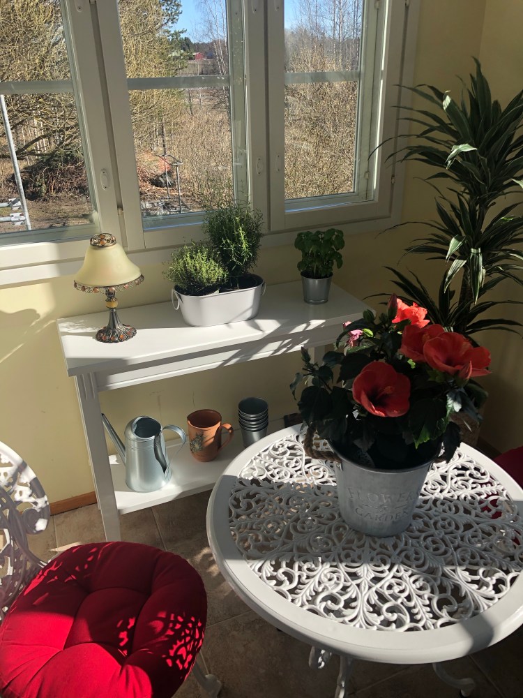 Mitä ihmeen tekemistä ranskalaisella kahvilalla on tekemistä sekaisen eteisen kanssa? Ei yhtään mitään ennen kuin asialle tekee jotain. Ajatuksena on siis hyödyttää talon aamuaurinkoisin paikka romuvaraston sijasta johonkin aivan muuhun. Ja kun alunperin piti sapatin aikana kierrellä vähän maailmaa niin tuodaan maailma kotiin.