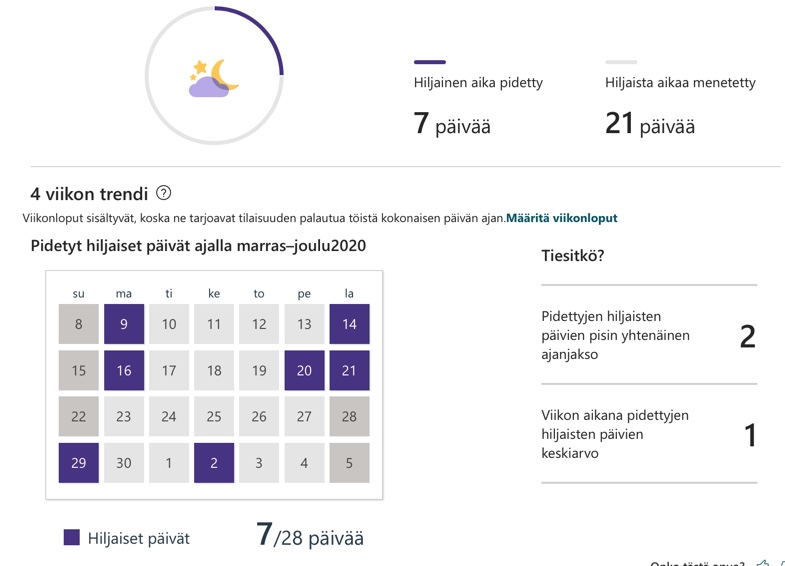 Olen pyrkinyt pyhittämään viikonloput palautumiseen. Kiitos Microsoftin tuokin illuusioni on särkynyt. O365:n MyAnalytics paljastaa etteivät viikonloput enää ole mikään palautuspäivä illoista puhumattakaan. Neljän viime viikon sisällä seitsemän ”hiljaista päivää” jolloin arkisin ei ole tullut tehtyä hommia iltaisin tai ylipäänsä viikonloppuisin.